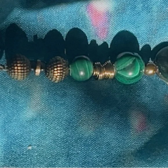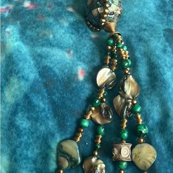 This breathtaking, homemade necklace consist of clusters of malachite, freshwater pearls, intertwine with gold wire and separators. The Avalon ball is surrounded by small accent pearls all throughout this beautiful statement necklace. 12 inches from the top to the middle, and 8 inches from the ball to the bottom. 20 inches total. #DTBDDARETOBEDIFFERENT